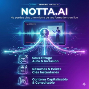 Notta est un outil d’intelligence artificielle qui permet d’ajouter automatiquement des sous-titres aux formations à distance, tout en générant des transcriptions complètes, des résumés et des points clés.